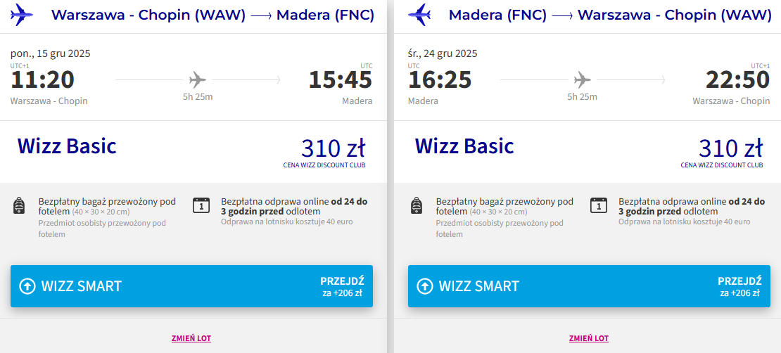 Na Maderę polecisz bezpośrednio z Wizz Air. Do wyboru masz podróże z Gdańska, Katowic lub Warszawy. Bilety w najniższej cenie zarezerwują członkowie Wizz Discount Club, pozostałe osoby zapłacą nieco więcej. W cenie możesz zabrać bagaż podręczny.