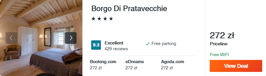 Po wylądowaniu w Pizie pierwszą noc spędźcie w jej okolicy, by zobaczyć słynną krzywą wieżę 😊. W tym celu zatrzymajcie się w 3* hotelu Borgo Di Pratavecchie. Do dyspozycji gości oddano klimatyzowane pokoje z prywatnymi łazienkami oraz bezpłatny parking, co w przypadku waszej podróży będzie sporym ułatwieniem.