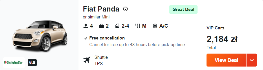 Zwiedzanie zachodniej Sycylii ułatwi wam wypożyczony samochód. To najwygodniejszy sposób, aby zobaczyć najciekawsze atrakcje oferowane przez region. Wybrałam dla was samochód marki Fiat (model Panda lub inne auto zbliżonej klasy).