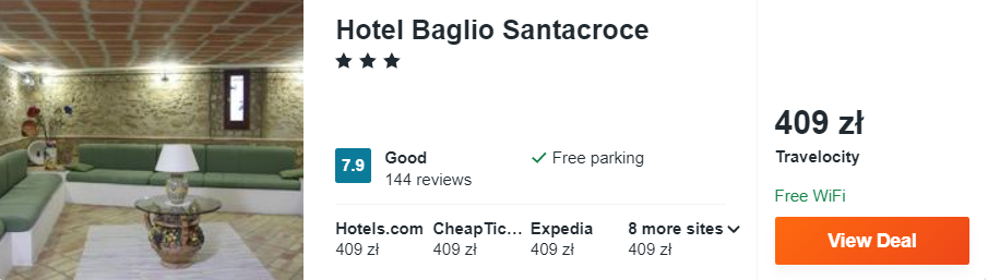 A co powiecie na zakwaterowanie z włoską duszą? Będąc w okolicy Trapani wybierzcie zakwaterowanie w 3* hotelu Baglio Santacroce. To, co wyróżnia ten obiekt, to przepiękna sycylijska panorama i elegancko urządzone wnętrza. Nie martwcie się odległością od plaży, na miejscu jest bowiem basen.