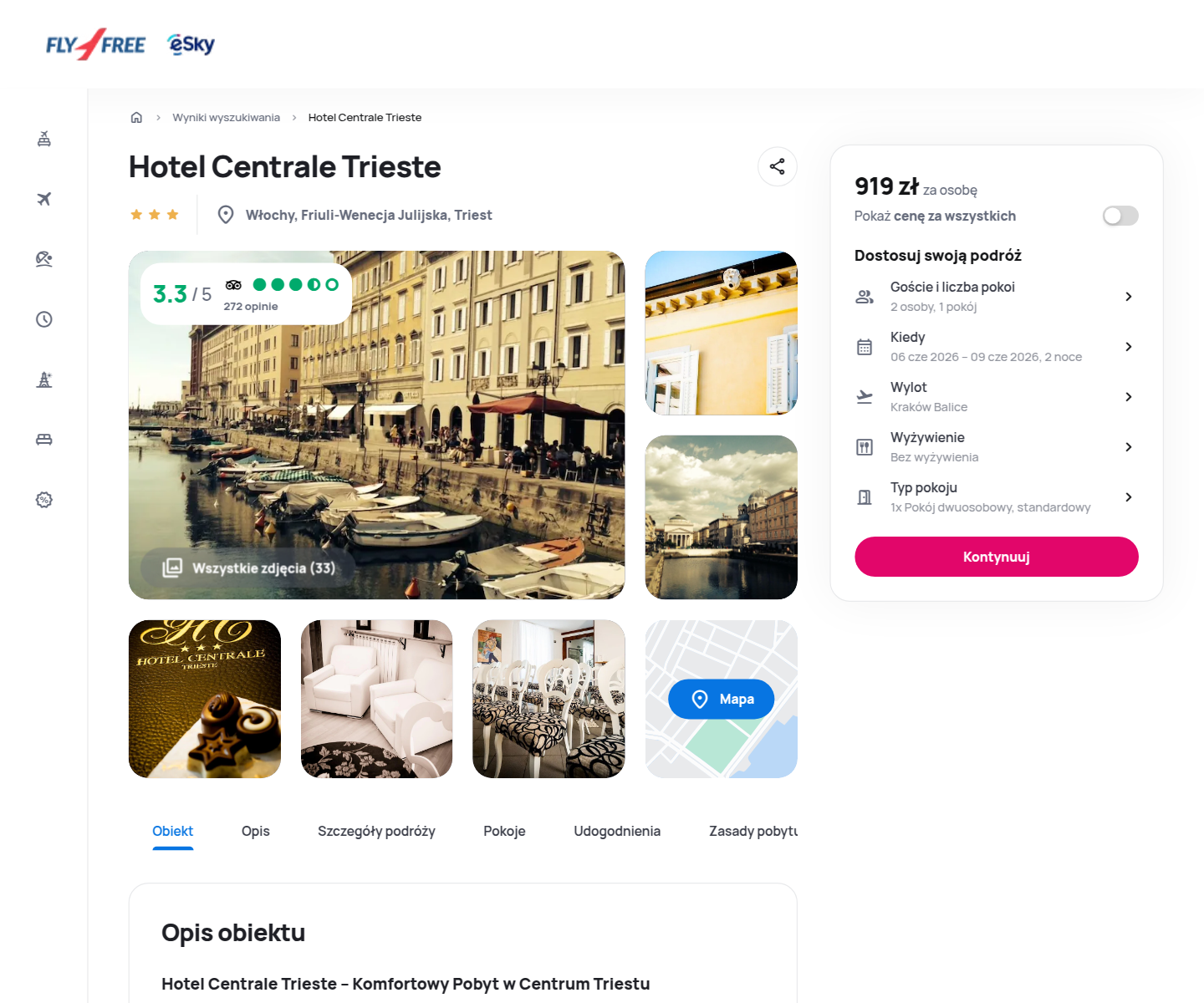 Na miejscu zatrzymasz się w 3* hotelu Centrale Trieste, położonym dosłownie 3 minuty spacerem od Kanału Grande i w pobliżu kościoła Sant’Antonio Taumaturgo. Goście chwalą hotel za świetną lokalizację pozwalającą dotrzeć pieszo do niemal wszystkich atrakcji miasta, a także za czystość pokoi i uprzejmą obsługę. Pokoje wyposażone są w telewizory z płaskim ekranem, a w obiekcie działa całodobowa obsługa pokojowa i bar. Stamtąd zaledwie kilka minut dzieli od Piazza della Borsa, rzymskiego teatru oraz portu, z którego można wybrać się na jednodniowe wycieczki do Słowenii lub Chorwacji. Miłośnicy historii docenią bliskość zamku Miramare i zamku Duino, a wielbiciele kultury – Teatro Giuseppe Verdi.