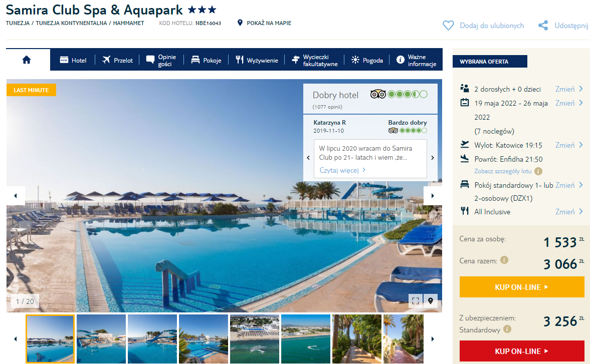 Do Tunezji udacie się w terminie 19 – 26 maja. Czeka was bezpośredni lot z Katowic lub Warszawy do Enfidhy, realizowany na pokładzie samolotu linii lotniczej Enter Air. W cenę biletów wliczono bagaż rejestrowany, dlatego tym razem nie będzie problemu ze spakowaniem wszystkich niezbędnych rzeczy.