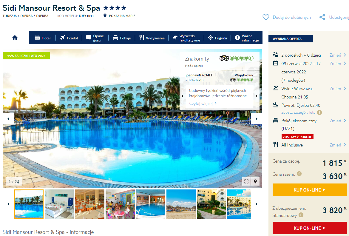 Na urlop do Tunezji udacie się w terminie 9 – 16 czerwca. Czeka was bezpośredni lot z Katowic lub Warszawy na Djerbę, realizowany na pokładzie samolotu linii lotniczej Enter Air. W pakiecie wliczono bagaż rejestrowany (nadawany do luku).