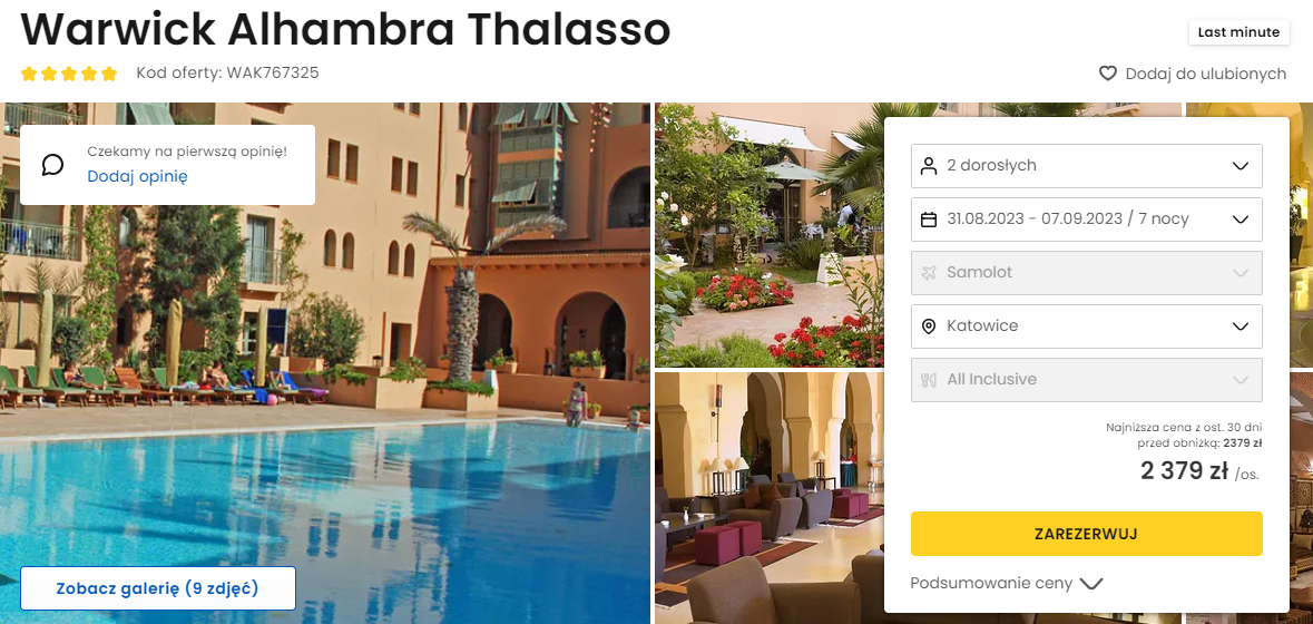 Urlop spędzisz w bardzo dobrze ocenianym 5* hotelu Warwick Alahambra Thalasso. Dla gości przygotowano odkryty basen z tarasem słonecznym, tradycyjnie zaaranżowane wnętrza, przestronne pokoje oraz centrum spa.