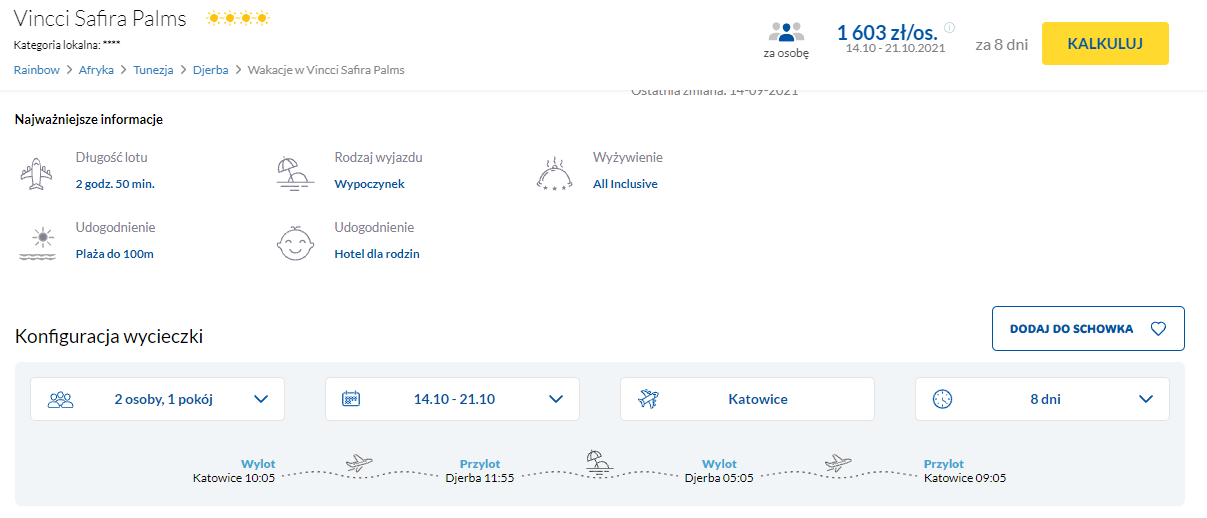 W podróż na Djerbę wybierzecie się już w tym tygodniu, w dniach 14 – 21 października. Czeka was bezpośredni lot z Katowic, realizowany na pokładzie samolotu linii lotniczej Nouvelair z wliczonym bagażem rejestrowanym. Na miejscu będziecie zakwaterowani w bardzo dobrym 4* hotelu Vincci Safira Palms, gdzie poza komfortowo urządzonymi pokojami, zielonym ogrodem oraz basenem, do waszej dyspozycji będzie wyżywienie w formule bogatego all inclusive.