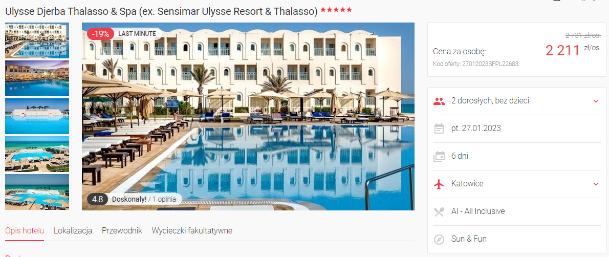 Wypoczynek zaplanowany został w bardzo dobrym 5* hotelu Ulysse Djerba Thalasso & Spa. Obiekt oferuje lokalizację bezpośrednio przy piaszczystej plaży, imponujących rozmiarów basen, komfortowe pokoje oraz wielokrotne nagradzaną strefę spa. Idealnej całości dopełni wyżywienie w formie zróżnicowanego all inclusive. Nic dziwnego, że hotel otrzymał wyróżnienie Travelers’ Choice portalu TripAdvisor.