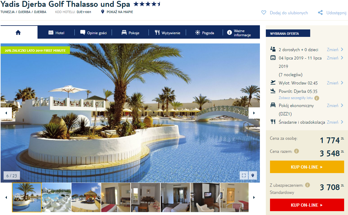 Yadis Djerba Golf Thalasso to propozycja na spokojny i klimatyczny urlop. Jest to propozycja zarówno dla rodzin z dziećmi jak i osób wypoczywających w parach. Na miejscu panują świetne warunki do aktywnego wypoczynku: hotel sąsiaduje z polem golfowym, na miejscu korty tenisowe, urządzenia sportowe i piękne baseny. Oferta zawiera przeloty, transfery jak również wyżywienie w postaci dwóch posiłków.