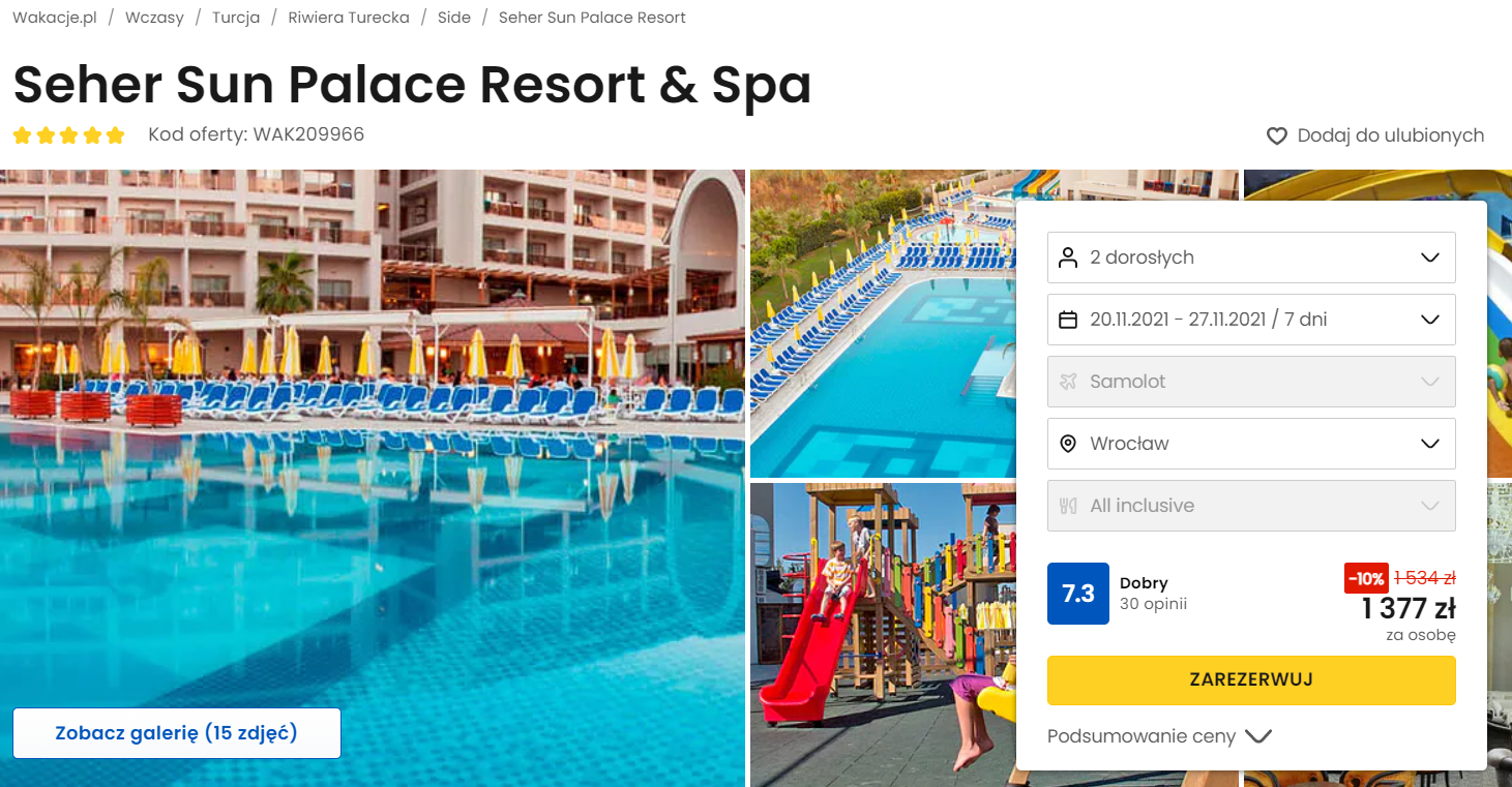 Na wycieczkę do Turcji udacie się już niedługo, bo w terminie 20 – 27 listopada. Na Riwierze Tureckiej zatrzymacie się w świetnym 5* hotelu Seher Sun Palace Resort & Spa, który położony jest 300 m od piaszczystej plaży. Do dyspozycji gości oddano basen, siłownię, centrum spa & wellness, bar oraz tematyczne restauracje.