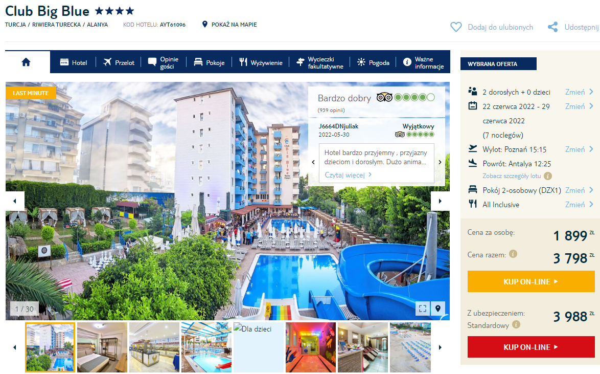 To propozycja dla spontanicznych podróżnych, bowiem urlop w Turcji zaplanowano w terminie 22 – 29 czerwca. Czeka was bezpośredni lot do Antalyi, realizowany na pokładzie samolotu linii lotniczej Ryanair Sun (z wliczonym bagażem rejestrowanym). Jako miejsce wylotu do wyboru macie 5 miast w Polsce (Warszawę, Poznań, Katowice, Wrocław oraz Szczecin).