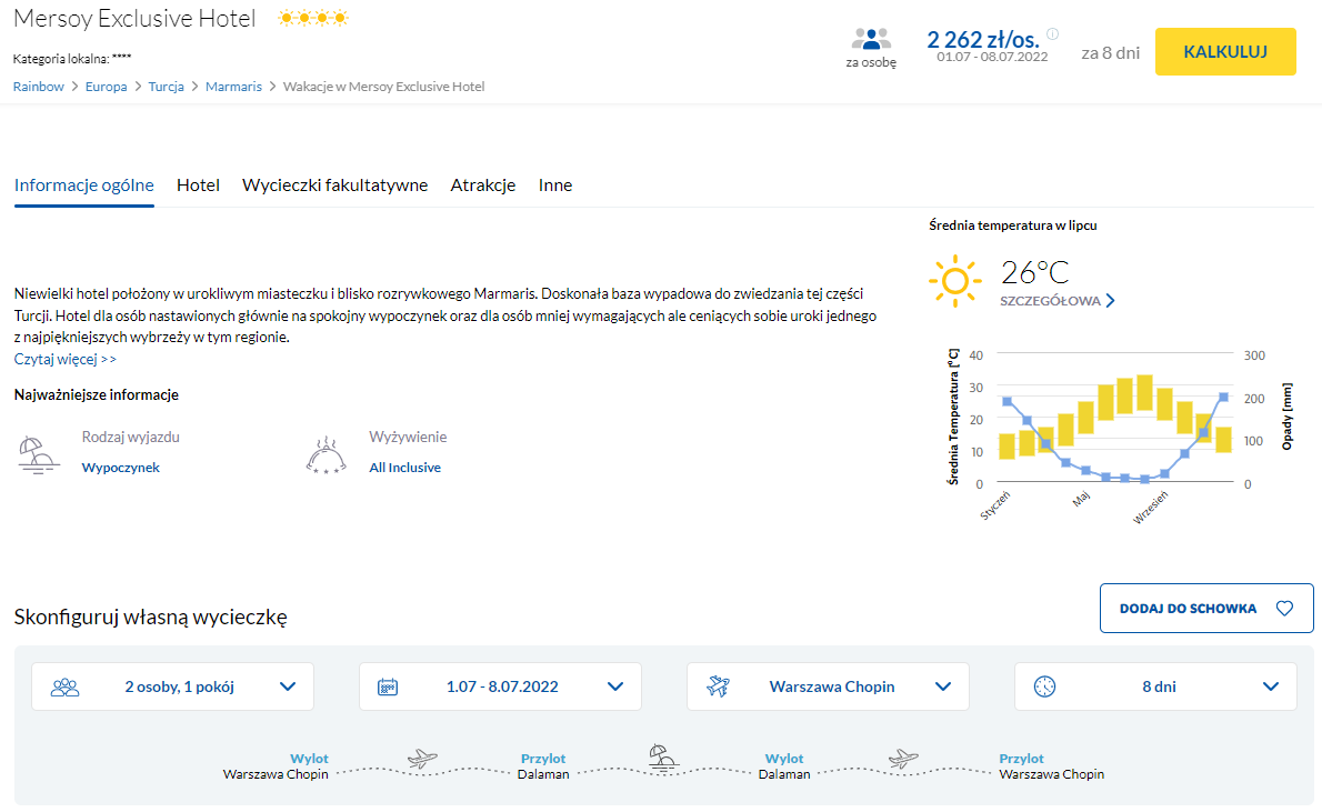 Urlop w Turcji zaplanowano w terminie 1-8 lipca. Na początek czeka was bezpośredni lot z Warszawy do Dalaman. W cenę pakietu wliczono także bagaż rejestrowany, dlatego z pewnością nie będziecie mieli problemu ze spakowaniem walizek.