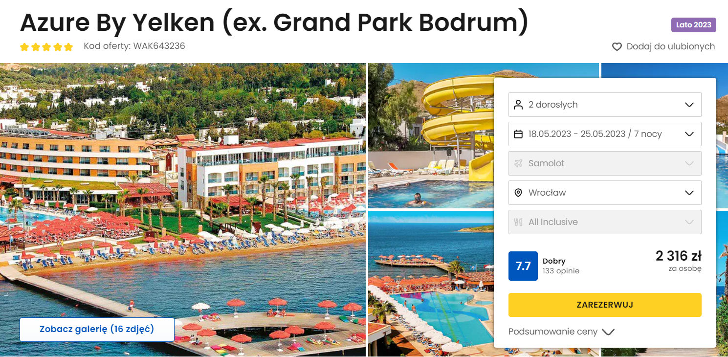 Urlop spędzisz dobrze ocenianym 5* hotelu Azure By Yelken. Kompleks znajduje się bezpośrednio przy piaszczystej plaży i posiada wiele udogodnień, takich jak: basen wewnętrzny i zewnętrzny, taras słoneczny, siłownię, strefę spa i wiele innych atrakcji, które znajdziesz w opisie oferty. Każdy pokój wyposażony został w klimatyzację, minibar, TV i balkon.