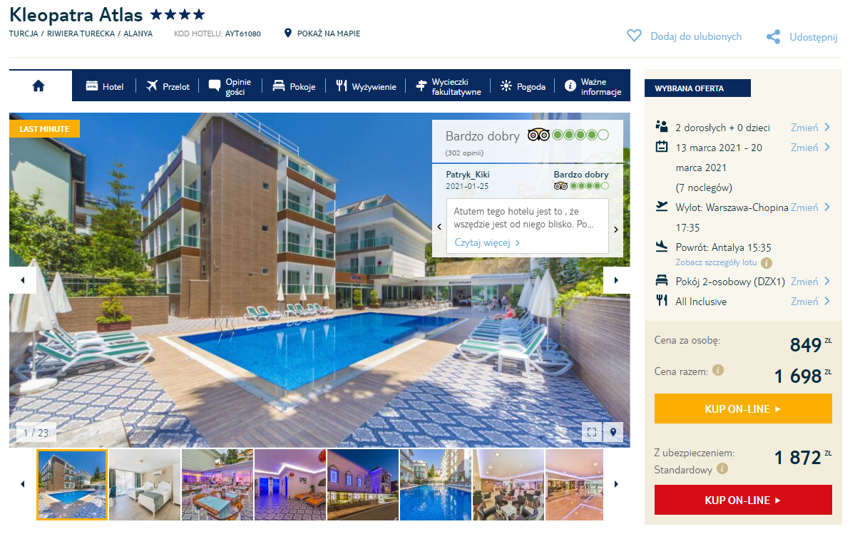 Oferta dla zdecydowanych podróżnych, lubiących spontaniczne wyjazdy. Powrót zimy daje wam się we znaki? Uciekajcie w najbliższy weekend w stronę słońca – na tureckie wybrzeże! Czeka tam na was położony niedaleko plaży 4* hotel z all inclusive oraz normalność okolicy w dobrym tego słowa znaczeniu – w Turcji atrakcje turystyczne, bary i restauracje pozostają otwarte.