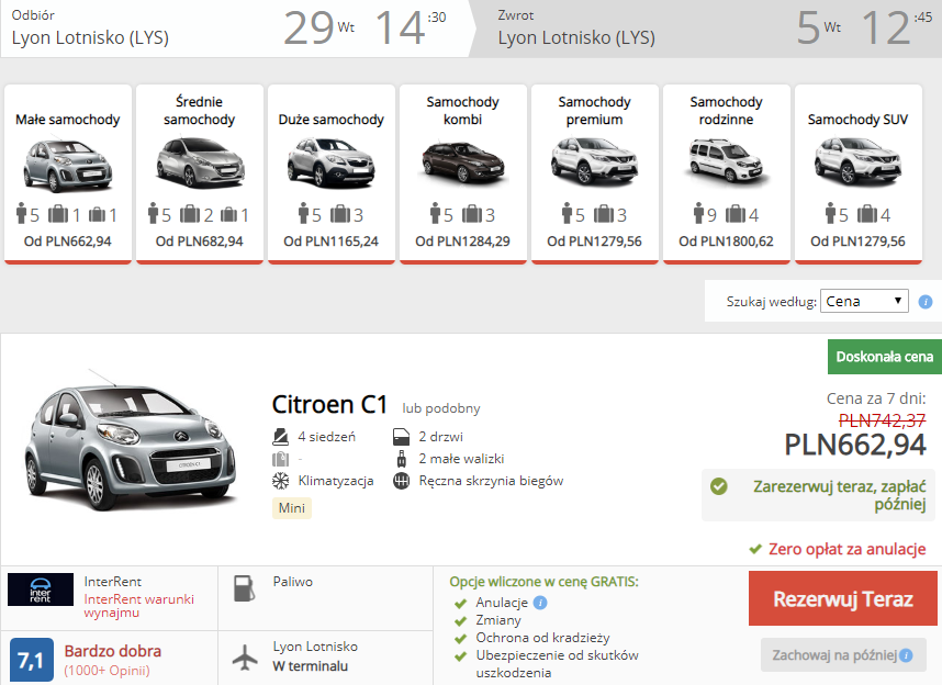 Wynajęcie auta za 663 PLN / 4 osoby (166 PLN / osoba) W celu uzyskania najniższej ceny należy spośród listy sprzedawców wybrać przewoźnika Wizz Air.