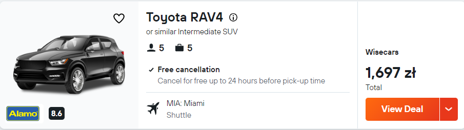 Do miejsca zakwaterowania, na przylądek Key West oraz do Centrum Kosmicznego Johna F. Kennedy’ego, jak i w pozostałe rejony Słonecznego Stanu, łatwo i wygodnie dojedziesz autem. Dlatego zachęcam cię do wypożyczenia samochodu zaraz po przylocie do Miami.