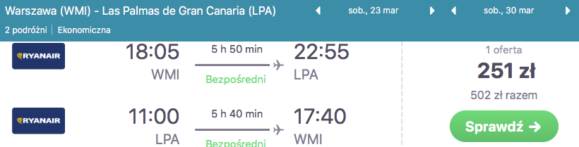 Loty z Warszawy do Las Palmas (23-30 marca) za 502 PLN / 2 osoby (251 PLN / osoba)
