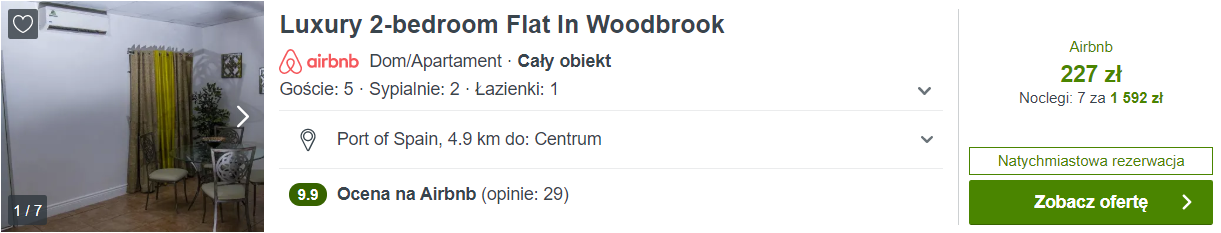 Apartament, w którym proponuję wam się zatrzymać, leży w stolicy kraju – Port of Spain. To świetna baza wypadowa do zwiedzania wyspy. Wasze lokum znajduje się blisko popularnej Ariapita Avenue, słynnego Queen’s Park Oval oraz wielu restauracji i barów przy Tragrete Road.