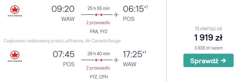 Na proponowaną przeze mnie wycieczkę na Karaiby wybierzecie się w drugiej połowie stycznia (21-29). W tym okresie spodziewajcie się na miejscu około 30°C i mnóstwo słońca. Sezon huraganów rozpoczyna się dopiero w czerwcu, nie musicie się o to martwić. Do Trynidadu i Tobago polecicie samolotem linii linią Air Canada z bagażem podręcznym. Po drodze czekają was przesiadki w Kopenhadze/Frankfurcie i Toronto. Dłuższy postój w Kanadzie (8h) możecie wykorzystać na szybki wypad na miasto.