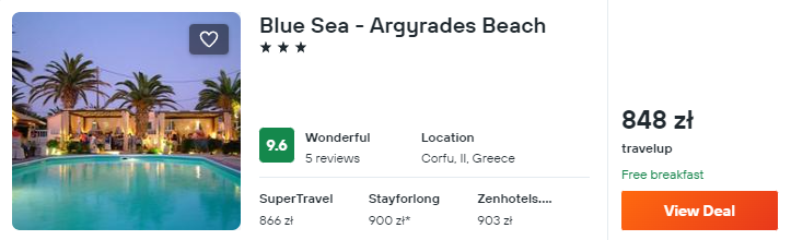 Na Korfu polecam zakwaterowanie w 3* Blue Sea – Argyrades Beach. W cenę noclegów wliczone są śniadania.