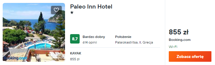 Wybrałem noclegi w bardzo dobrze ocenianym hotelu Paleo Inn. Znajduje się on w blisko przepięknej plaży Palaiokastritsa i będzie świetnym wyborem na spędzenie tygodniowego urlopu.