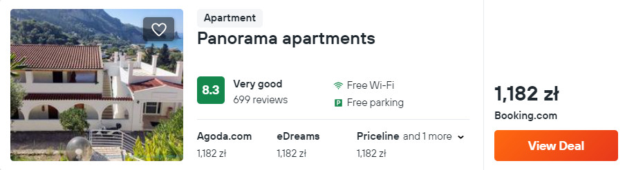 Na miejscu zatrzymasz się w obiekcie Panorama apartments, który znajduje się w miejscowości Agios Gordios. Z lotniska w okolice miejsca noclegowego komunikacją publiczną lub wypożyczonym samochodem – szczegóły poniżej.