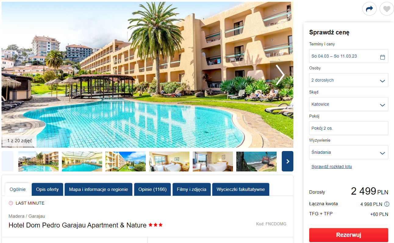 Na portugalską wyspę udasz się w terminie 4-11 marca. Czeka cię bezpośredni lot do Funchal, realizowany na pokładzie samolotu linii lotniczej Smartwings. Jako miejsce wylotu do wyboru masz Katowice, Poznań oraz Warszawę, a w podróż będziesz mógł zabrać również bagaż rejestrowany (nadawany do luku).