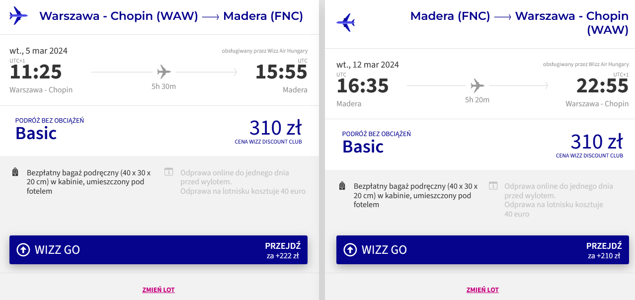 Na portugalską wyspę udasz się w terminie 5-12 marca z warszawskiego lotniska im. Fryderyka Chopina. W obie strony podróżować będziesz linią Wizz Air. W cenę biletu wliczony jest bagaż podręczny.