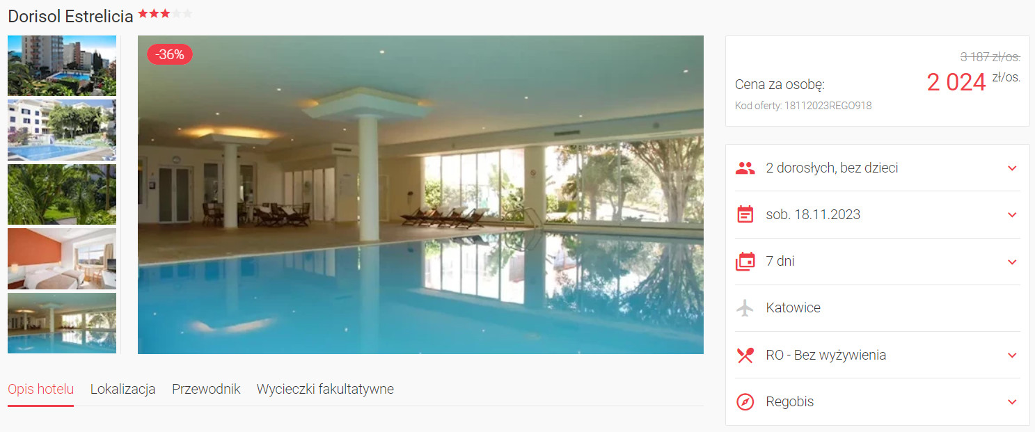 Na portugalskiej wyspie zatrzymasz się w 3* hotelu Dorisol Estrelicia, który położony jest w spokojnej części Funchal. Na terenie obiektu znajduje się odkryty i kryty basen, sauna sucha, wanna z hydromasażem i centrum fitness. Każde studio składa się z aneksu kuchennego, miejsca do relaksu i spania oraz łazienki. W cenie zapewnione są przeloty, transfery na trasie lotnisko – hotel – lotnisko oraz opieka rezydenta.