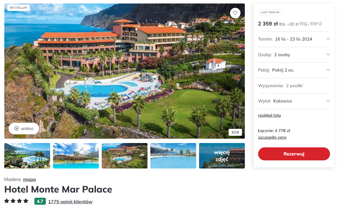 Zatrzymasz się w bardzo dobrze ocenianym 4* hotelu Monte Mar Palace. Obiekt oferuje dogodną lokalizację ze wspaniałym widokiem na ocean, basen, zielony ogród oraz świetnie wyposażone zaplecze sportowe.