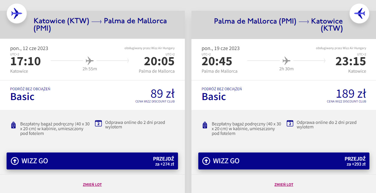 Na Majorkę udasz się z katowickiego lotniska w Pyrzowicach w terminie 12-19 czerwca. W obie strony polecisz na pokładzie samolotu linii Wizz Air z wliczonym małym bagażem podręcznym. Bilety w najniższej cenie dostępne są dla osób z Wizz Discount Club. Chętni na loty bez WDC zapłacą więcej.