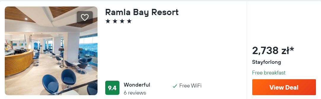 Na wyspie zatrzymasz się w bardzo dobrze ocenianym przez dotychczasowych gości 4* hotelu Ramla Bay Resort, który znajduje się w pobliżu wybrzeża. Z lotniska w okolice miejsca noclegowego komunikacją publiczną lub wypożyczonym samochodem – szczegóły poniżej.