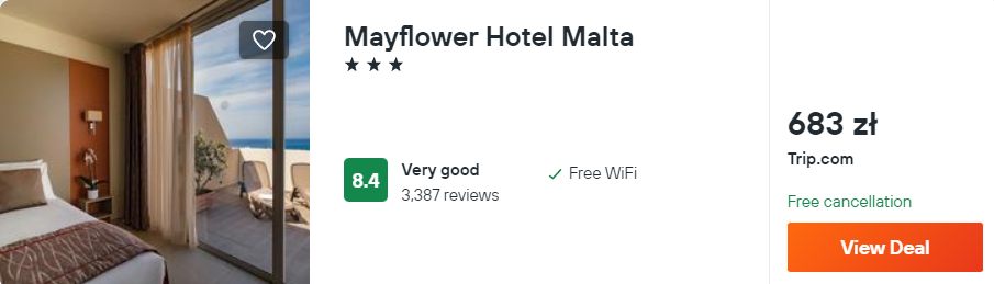 Na Malcie rekomenduję noclegi w 3* hotelu Mayflower. Na miejscu skorzystasz z pokoju z prywatną łazienką, tarasu i WiFi. Obiekt zlokalizowany został w niewielkiej odległości od wybrzeża.