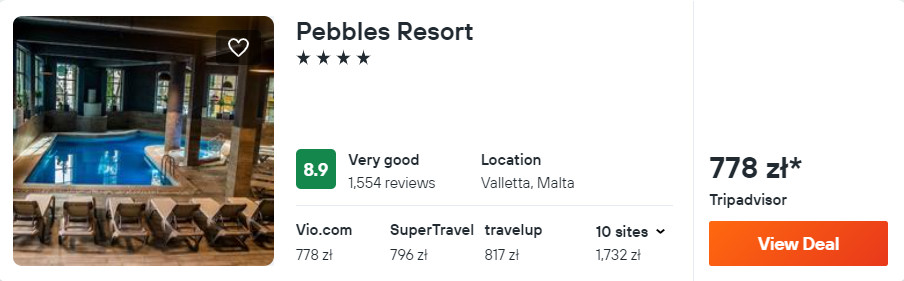 Na Malcie rekomenduję ci noclegi w 4* hotelu Pebbles Resort. Na jego terenie znajduje się kryty basen z podgrzewaną wodą oraz centrum fitness. Każdy pokój wyposażony został w klimatyzację, telewizor LCD, minibar oraz czajnik elektryczny. W łazience jest prysznic, suszarka do włosów oraz podstawowe przybory toaletowe.