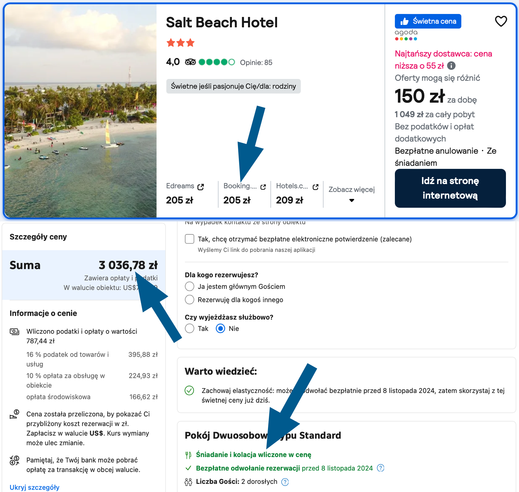 Na Malediwach polecam noclegi w Salt Beach Hotel. W cenę zakwaterowania wliczone są śniadania i kolacje.