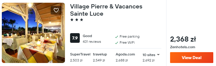 Na Martynice proponuję pobyt w hotelu Village Pierre & Vacances. Obiekt położony jest bezpośrednio przy prywatnej plaży. Na miejscu znajdziesz basen zewnętrzny, restaurację i komfortowo urządzone pokoje.