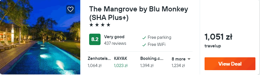 W Tajlandii zakwaterowani będziecie w 4* hotelu The Mangrove by Blu Monkey, który położony jest nad zatoką Chalong, a od najbliższej plaży oddalony jest o 150 metrów. Z lotniska w okolice miejsca noclegowego dojedziecie za ok. 60 PLN.