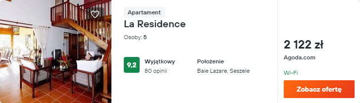 Za pakiet obejmujący loty oraz zakwaterowanie w apartamencie zapłacisz 4114 PLN za osobę, przy 2 podróżnych śpiących w jednym pokoju.