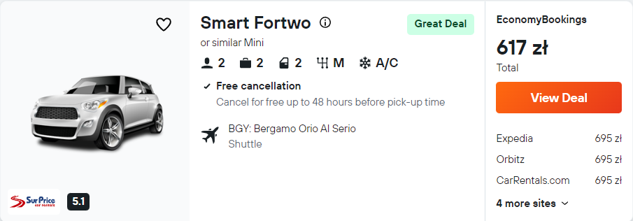 Wypożycz auto już na lotnisku w Bergamo. Samochód pozwoli ci wygodnie dojechać do hotelu i zwiedzić okolicę.