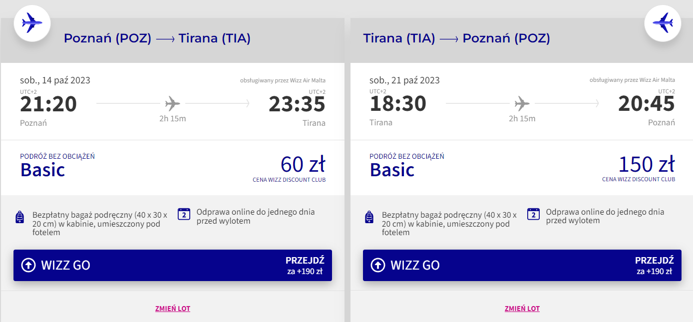 Do Tirany udasz się w dniach 14 – 21 października z lotniska w Poznaniu. W obie strony polecisz na pokładach samolotów linii lotniczej Wizz Air z wliczonym małym bagażem podręcznym. Bilety w najniższej cenie dostępne są dla członków Wizz Discount Club.