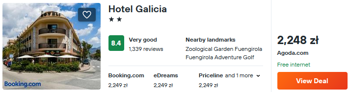 W Hiszpanii zatrzymaj się w bardzo dobrze ocenianym hotelu Galicia, który dzięki lokalizacji niedaleko plaży, będzie doskonałym miejscem na relaks, a także świetną bazą wypadową do zwiedzania południa Półwyspu Iberyjskiego. Z lotniska w Maladze do miejscowości Fuengirola, gdzie znajduje się hotel, dojedziesz komunikacją publiczną lub wypożyczonym samochodem.