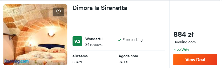 W miejscowości Alberobello proponuję wyjątkowe zakwaterowanie w domku trullo. W cenę noclegów wliczono śniadania. Natomiast w Polignano a Mare wybrałem dla ciebie pobyt w Dimora la Sirenetta, który mieści się w pobliżu wybrzeża.