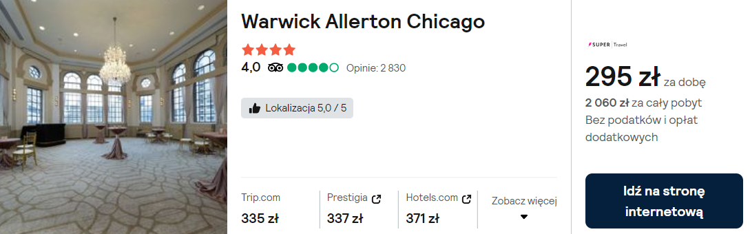 W Chicago polecam noclegi w 4* hotelu Warwick Allerton Chicago, który mieści się w centrum miasta. Do twojej dyspozycji zostanie oddany komfortowy pokój z prywatną łazienką, zestawem kosmetyków i WiFi.