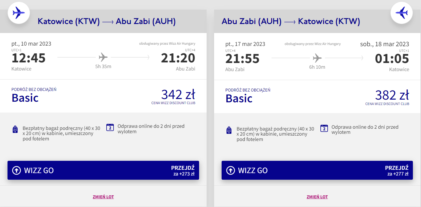 Na urlop udasz się z portu lotniczego Katowice-Pyrzowice w terminie 10-17 marca przyszłego roku. Do Abu Zabi i z powrotem polecisz na pokładach samolotów linii Wizz Air z wliczonym małym bagażem podręcznym.