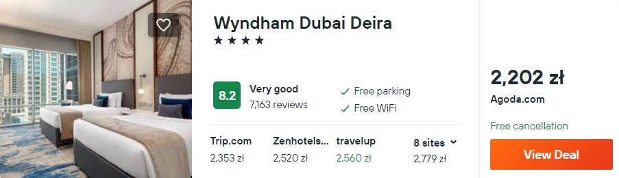 W Dubaju wybrałem dla ciebie zakwaterowanie w 4* hotelu Wyndham. Obiekt jest bardzo dobrze oceniany przez dotychczasowych gości. Znajdziesz tam basen na dachu, siłownię i strefę relaksu. W pobliżu znajduje się stacja metra.