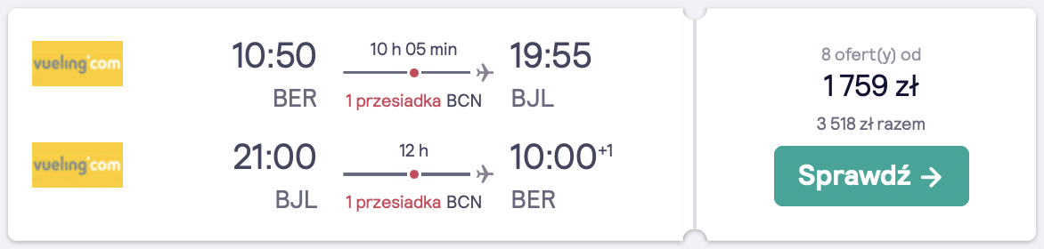 Do Bandżulu polecicie z Berlina w terminie 9-16 listopada. Po drodze czekają was przesiadki na lotnisku w Barcelonie. Pamiętajcie, że w cenę biletów lotniczych wliczony jest wyłącznie bagaż podręczy. Przed wyjazdem warto przeczytać nasz poradnik, jak się spakować, a nie będziecie mieli z tym problemu. Wylot z Berlina? Sprawdźcie nasz artykuł, w którym podpowiadamy, jak tanio dostać się do stolicy Niemiec.