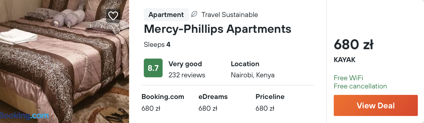 W Nairobi wybrałem dla ciebie zakwaterowanie w bardzo dobrze ocenianym aparthotelu Mercy-Phillips. Na miejscu do dyspozycji gości zostanie oddany komfortowo urządzony pokój z prywatną łazienką, balkonem i darmowym WiFI. Obiekt będzie idealną bazą wypadową do zwiedzania lokalnego parku narodowego.