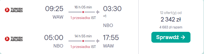 Do Afryki udacie się w terminie zahaczającym o długi weekend listopadowy: 10(11)-18.11. Do Kenii polecicie z Warszawy na pokładzie samolotów linii Turkish Airlines. Po drodze zaplanowano bezpieczne, gwarantowane przez przewoźnika przesiadki w Stambule. W cenę biletów wliczony jest bagaż rejestrowany.
