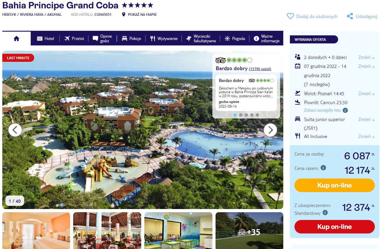 Wczasy spędzisz w świetnym 5* hotelu Bahia Principe Grand Coba, który zlokalizowany został 500 m od plaży. Na miejscu skorzystasz z takich udogodnień jak: odkryty basen, jacuzzi, taras słoneczny, siłownia i różnego rodzaju sporty. Pokoje zostały wyposażone w prywatne łazienki, klimatyzację, WiFi oraz balkon lub taras. Wszystkiego dopełni wyżywienie w komfortowej formule all inclusive.