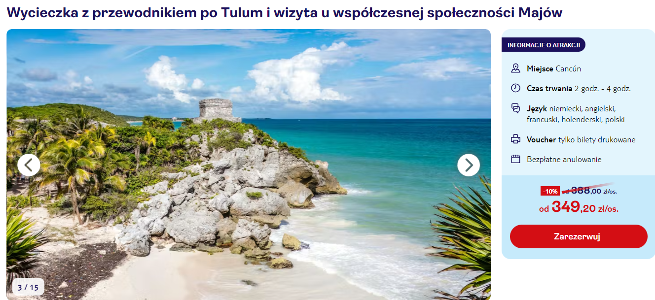 Wybierz się na niezwykłą wycieczkę do Tulum! Zobacz starożytne zabytki, piękne plaże, a na koniec będzie okazja na kąpiel w wyjątkowej studni krasowej – a to wszystko w czasie zwiedzania z przewodnikiem.