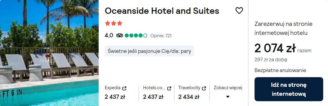Na Florydzie zatrzymasz się w 3* Oceanside Hotel and Suites, który od znajduje się w odległości 150 metrów od plaży Miami Beach. Z lotniska w okolice miejsca noclegowego dojedziesz komunikacją publiczną lub wypożyczonym samochodem.