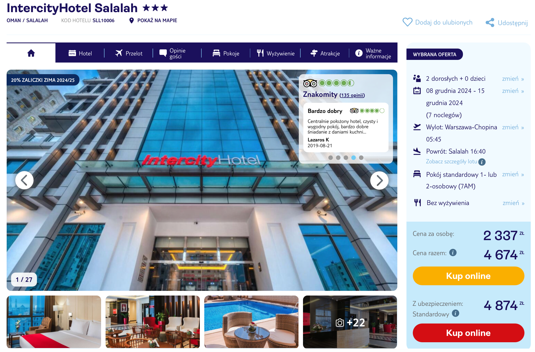 W Salala zatrzymasz się w dobrym 3* IntercityHotel, z basenem na dachu! Ponadto na terenie obiektu mieści się centrum fitness, bezpłatny parking, a we wszystkich pomieszczeniach będziesz miał zapewniony dostęp do sieci WiFi. Każdy pokój wyposażony jest w klimatyzację, telewizor LCD, minibar oraz czajnik elektryczny. W łazience jest prysznic, suszarka do włosów oraz podstawowe przybory toaletowe.